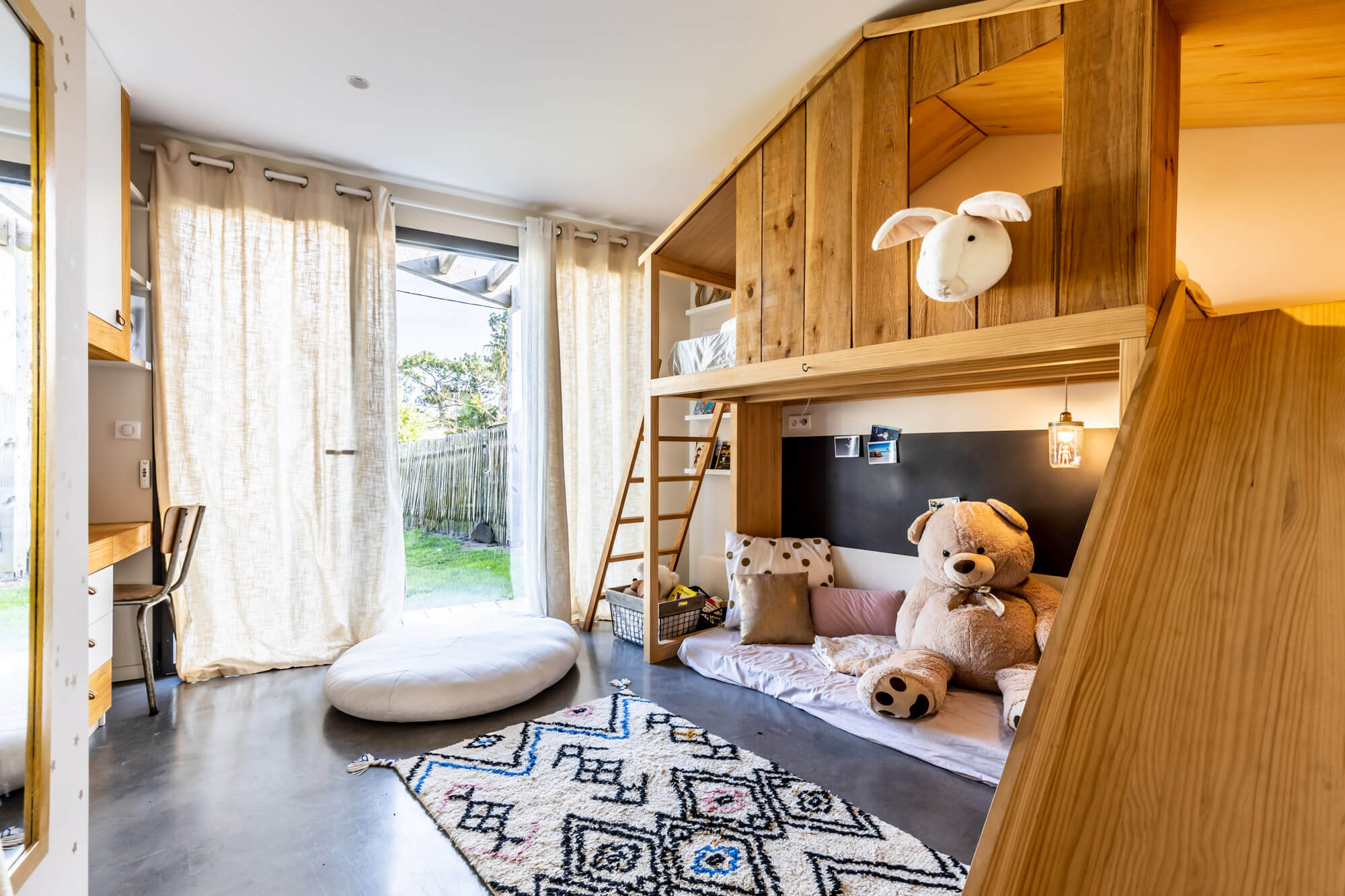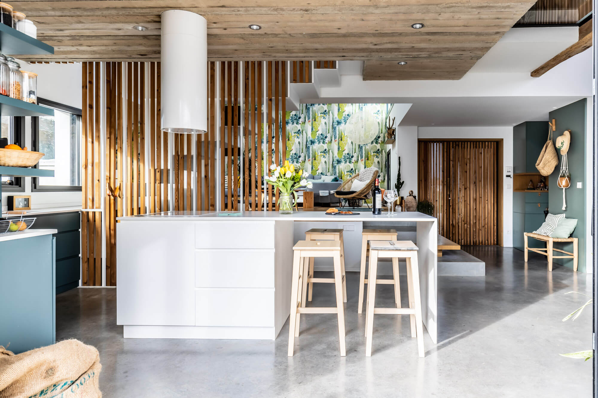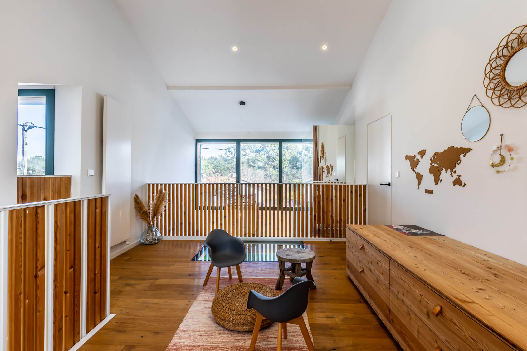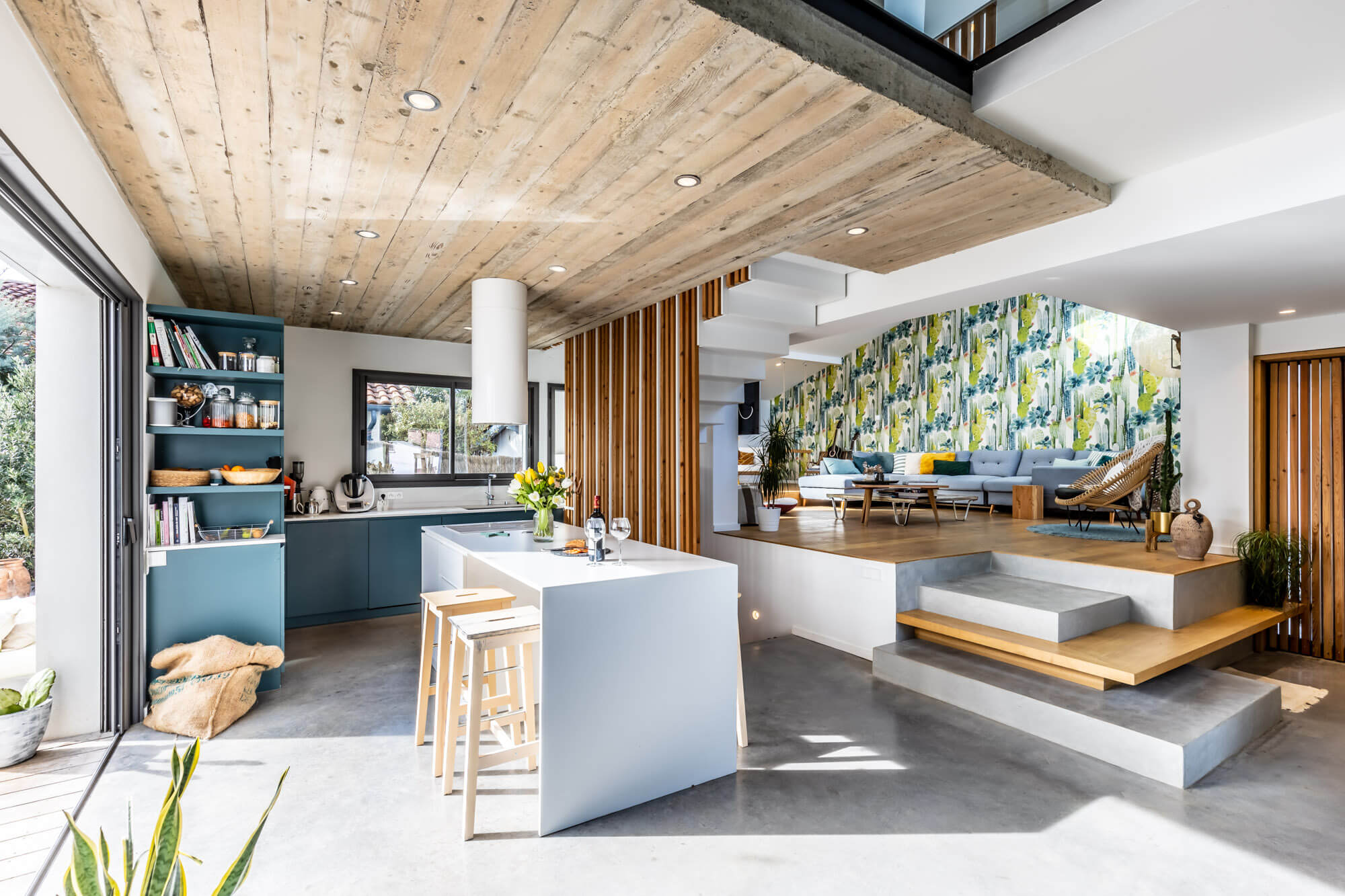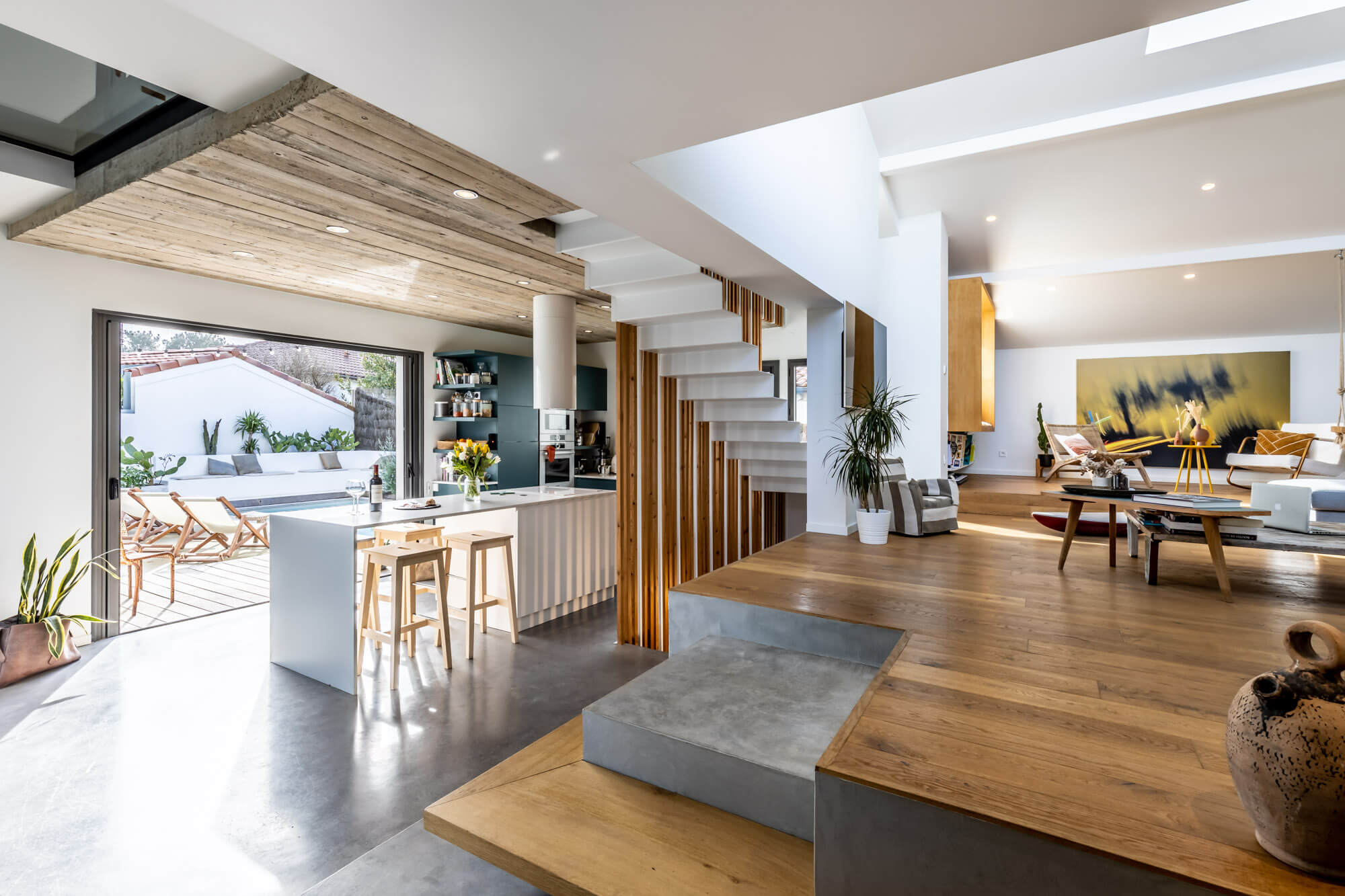 Ici tout est douceur et modernisme. Les propriétaires ont dessiné leur maison de famille idéale où chacun peut garder son espace intime tout en conservant une magnifique et spacieuse pièce de vie. Les volumes sont généreux et résolument contemporains.
