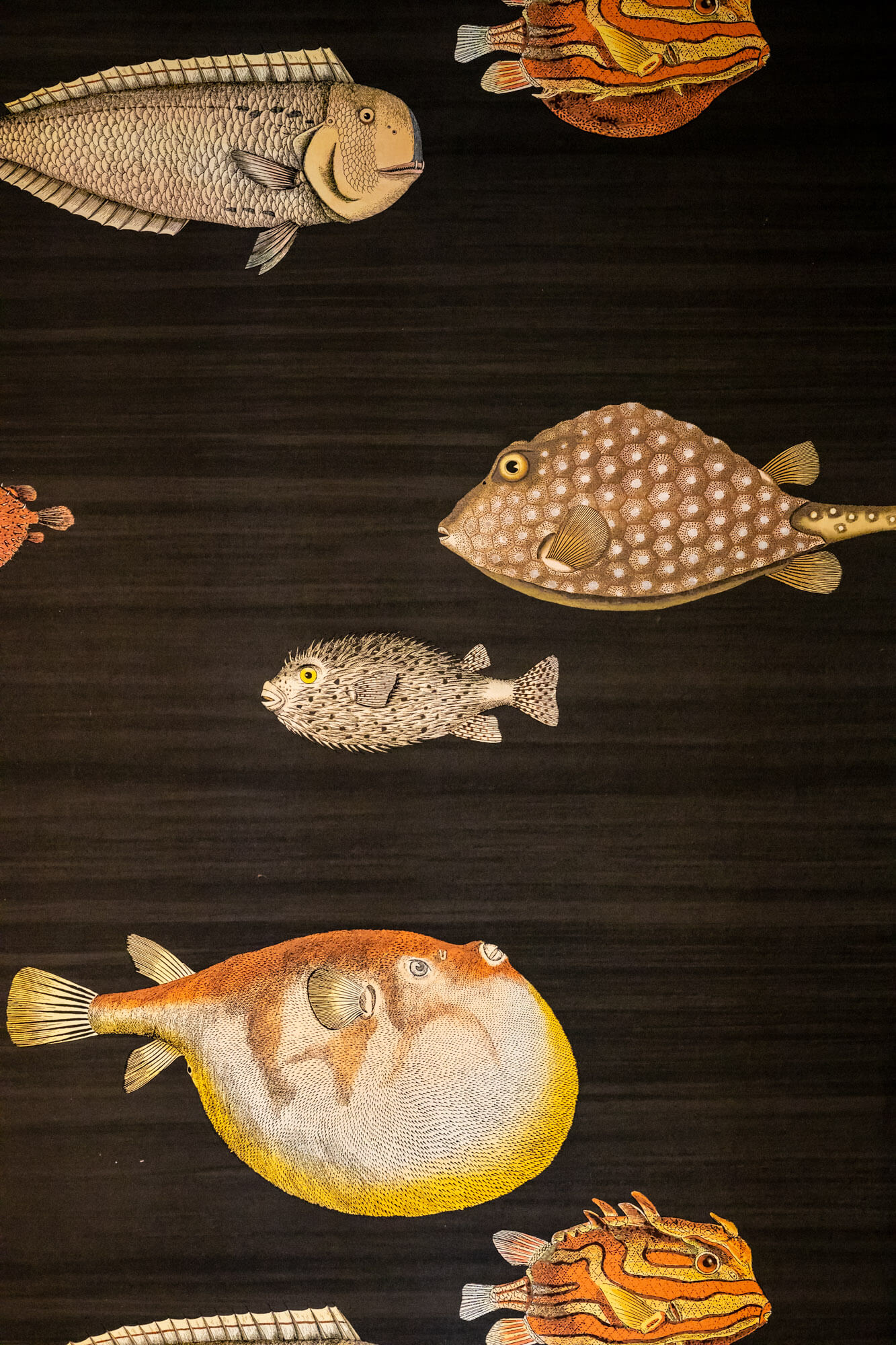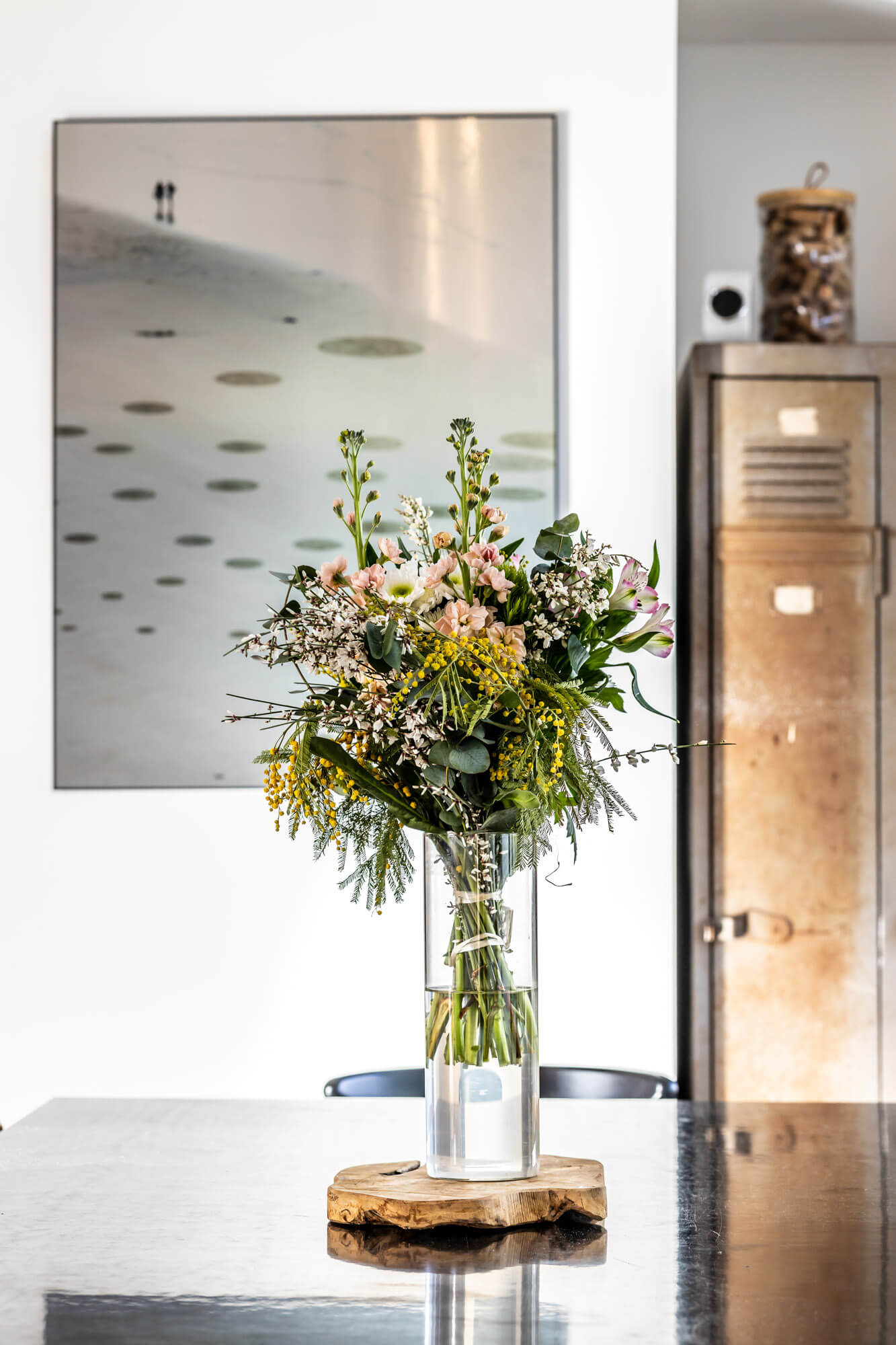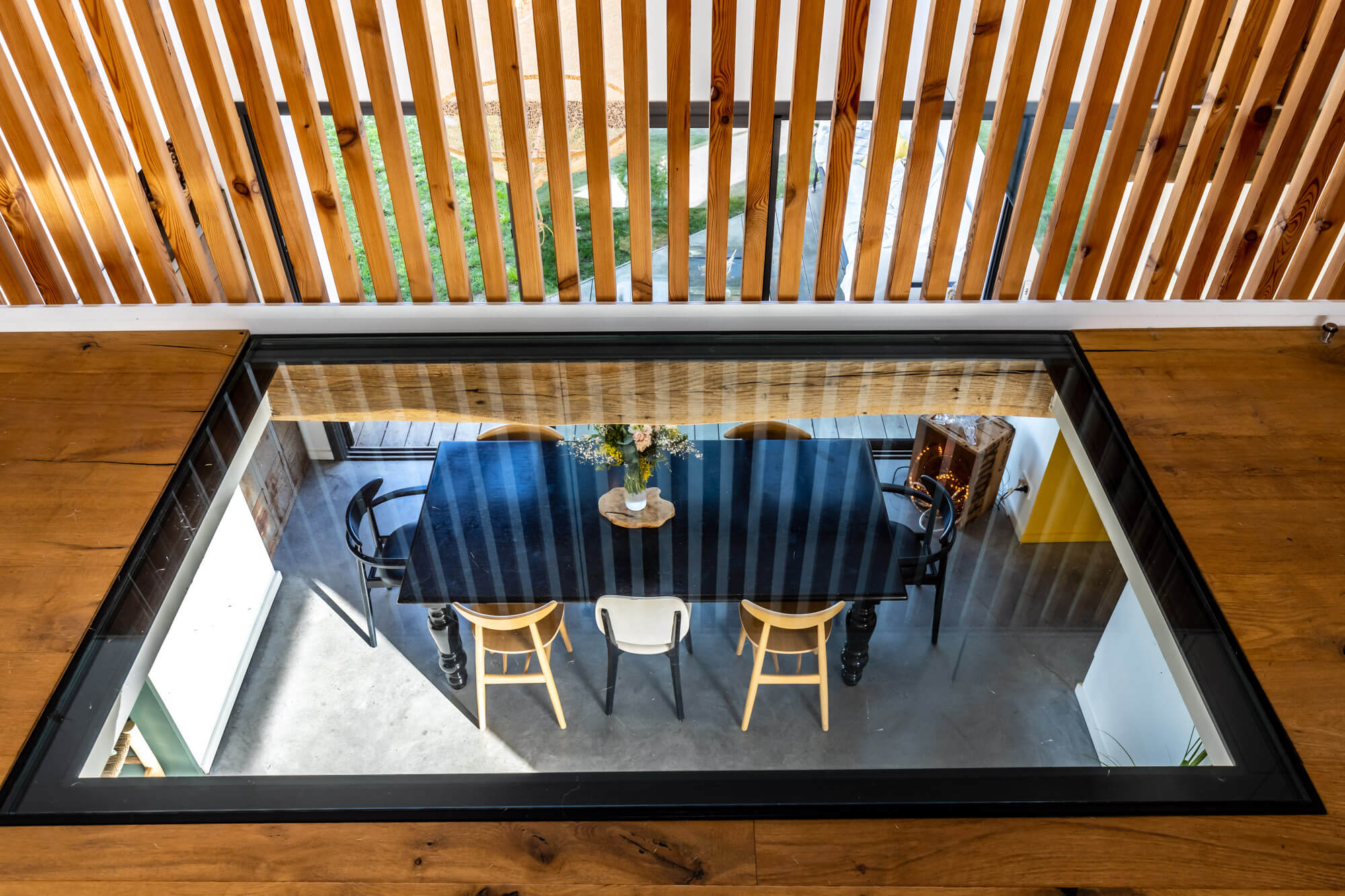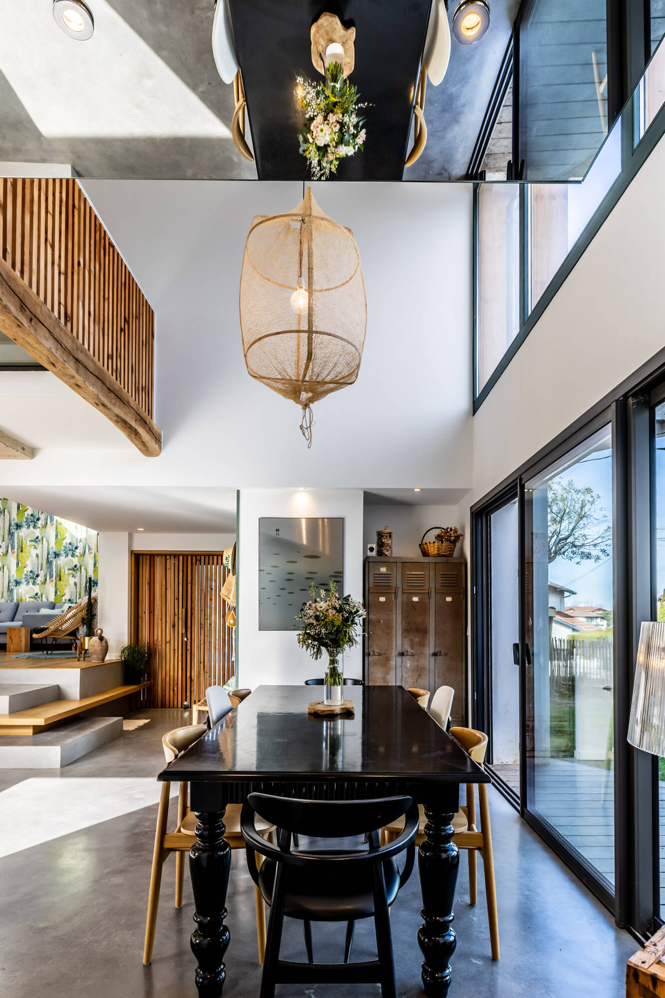 La salle à manger est magnifiée par un incroyable bloc miroir suspendu.