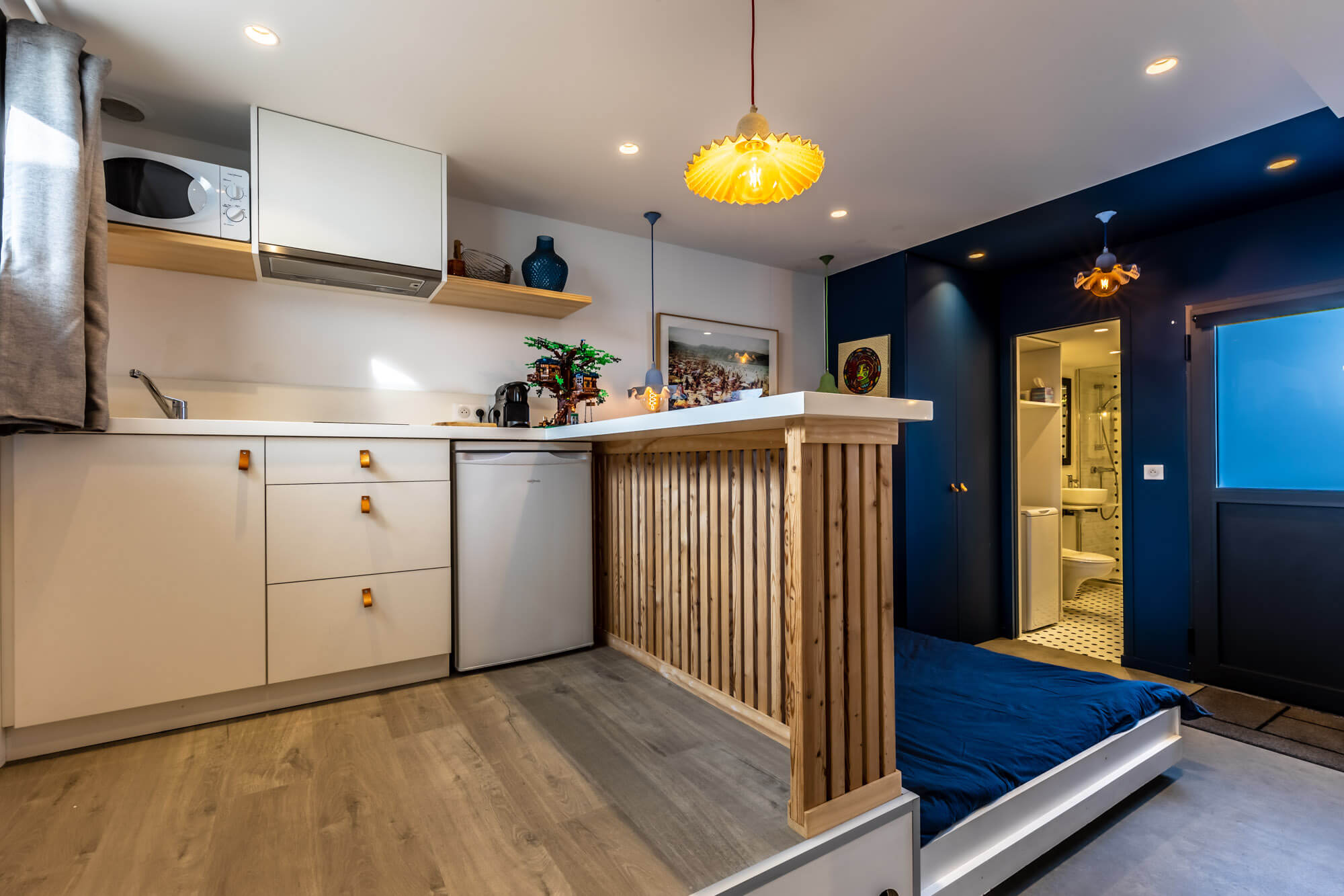 La cuisine équipée est ouverte sur la partie salle à manger et son salon.