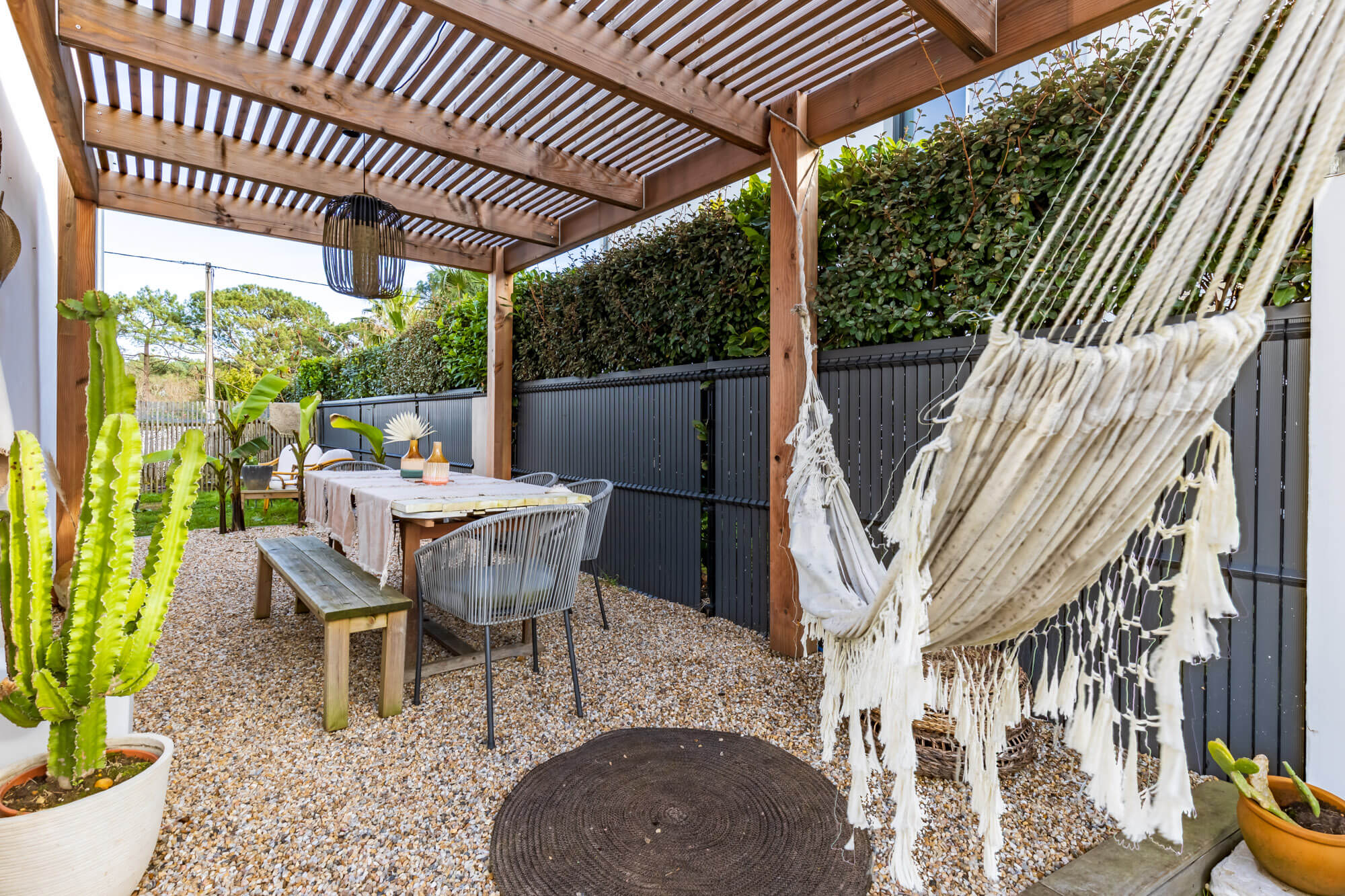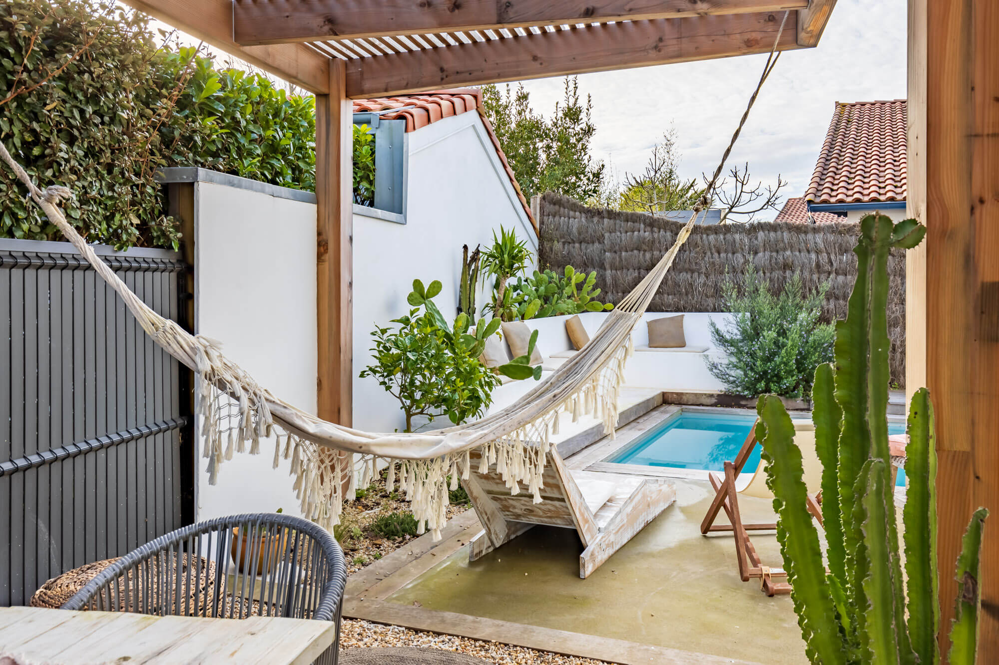 La ville se compose de 5 chambres, dont une belle suite parentale, 3 salles de bain, un studio indépendant dans une partie de la villa. Concernant les extérieurs, vous profiterez d’un coin piscine (3 X 6, traditionnelle en béton,avec liner, avec pompe à chaleur, enterrée entièrement, au sel) intimiste, d’un coin pour manger sous une pergola et d’un jardin de 750 M2 environ (à repaysager).