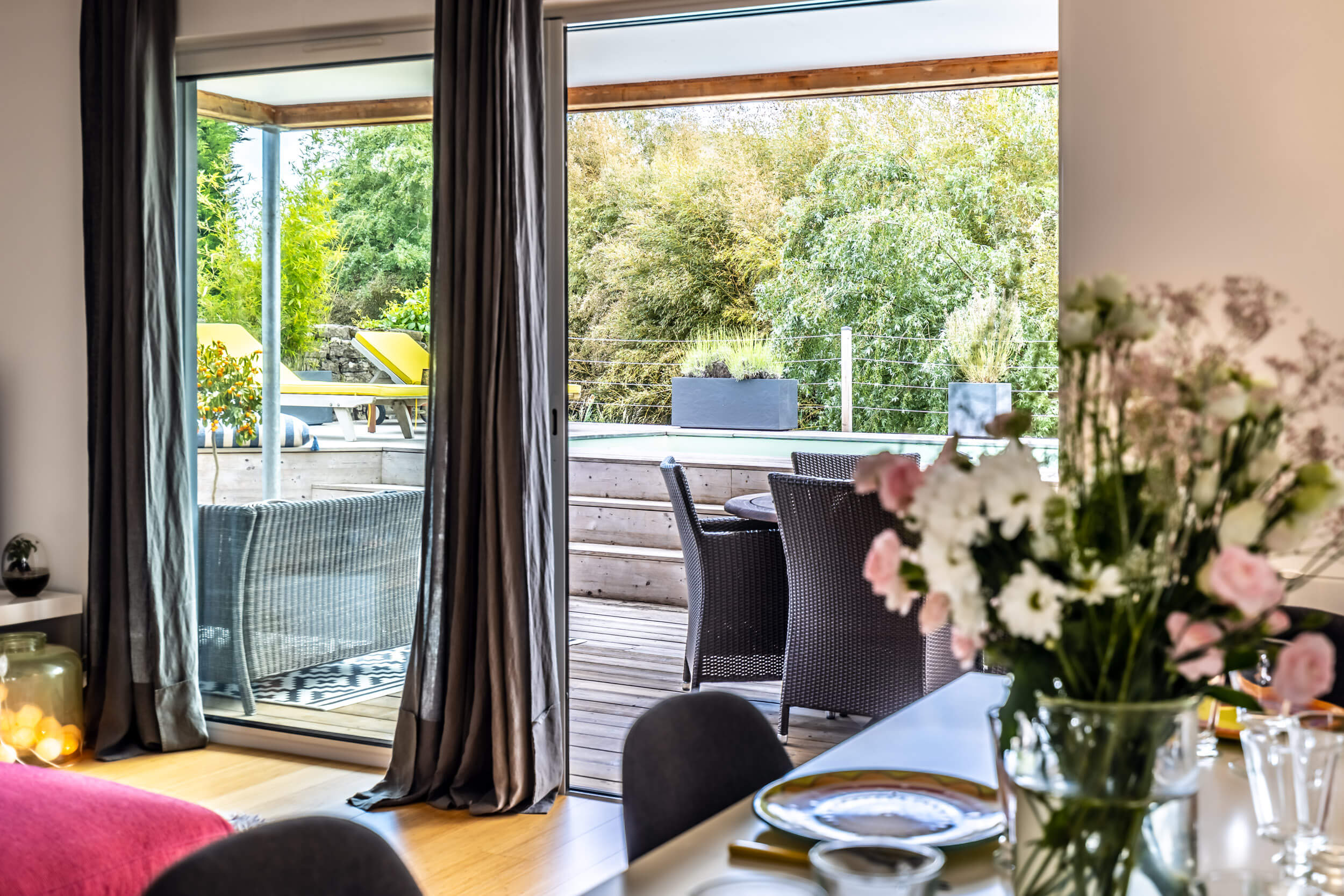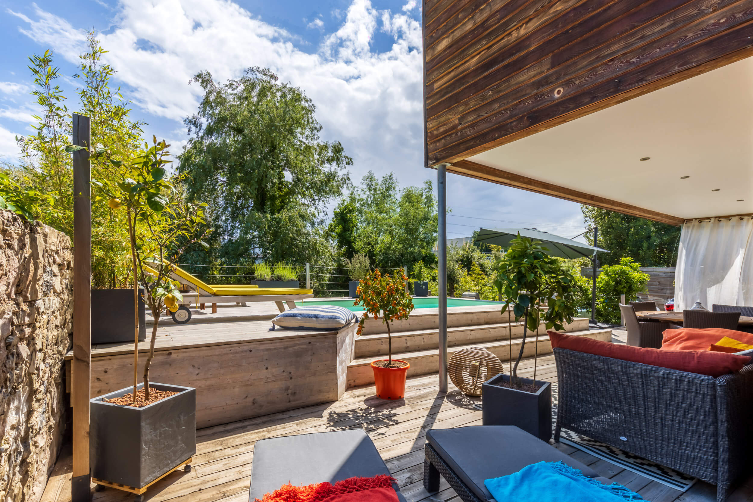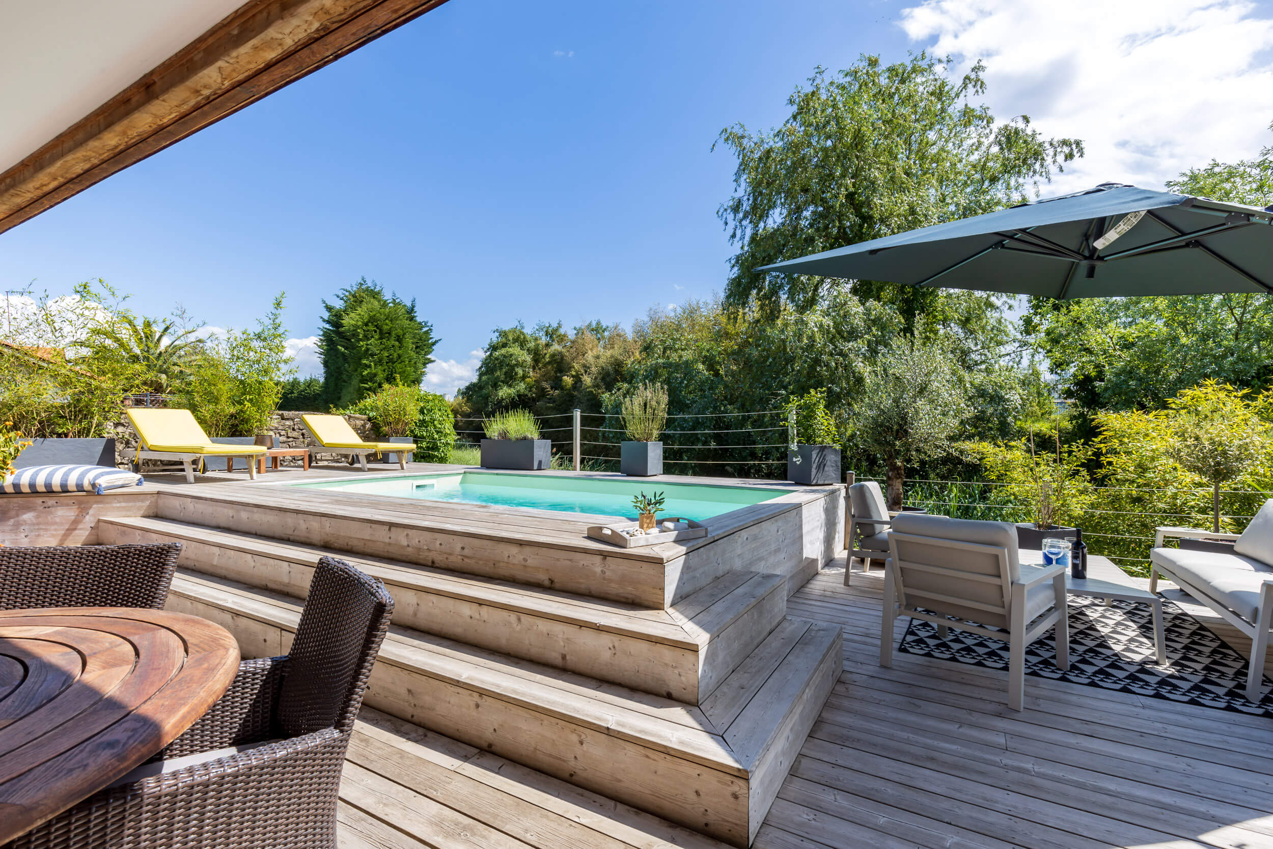 Une piscine et un espace extérieur des plus cosy sans vis à vis avec plusieurs coins aménagés pour le confort de